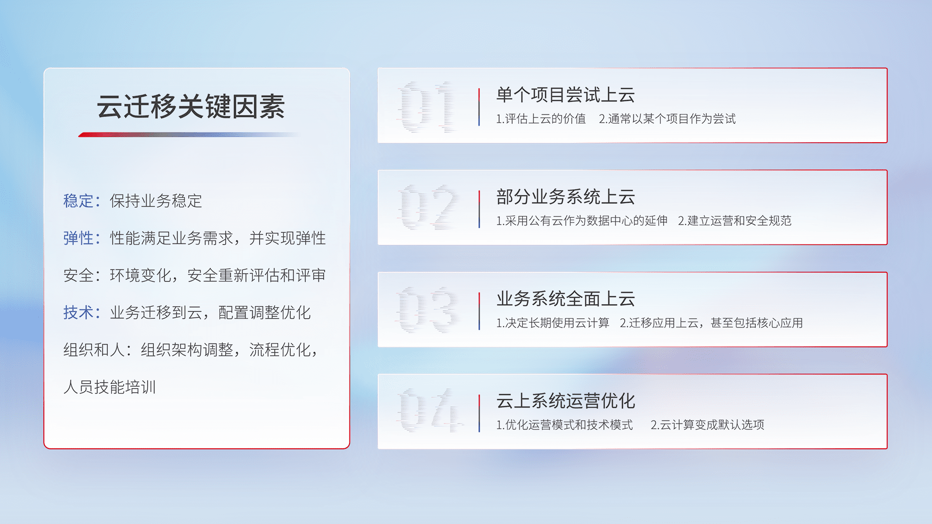 结合实际业务,,从规划设计、、云平台选型、、、云原生改造、、数据迁移、、、集成交付,,,,迁移全过程为客户识别最佳上云路径,,做好风险识别管理,,设计网络架构、、、身份权限、、、、安全审计合规、、、操作审计、、、、日志审计、、、、监控告警策略、、、、多站点容灾设计等,,对云上基础设施进行整体规划,,,提升IT治理水平,,,,以满足弹性、、、高可用、、、、高性能的需求。。