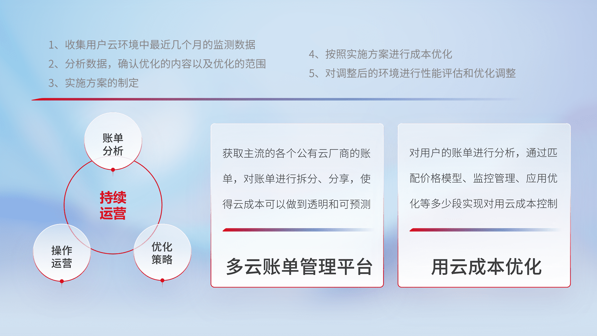 通过多云纳管,,,,以统一的资源数据模型把客户的云资源进行抽象和封装,,,进而实现对多云资源的统一操作,,,,保障云资源管理的可靠性、、稳定性与可用性。。量身定制化运维内容,,配置、、、、开发运维、、、补丁管理、、、备份、、、、监控、、、、认证和访问管理、、、、审计和日常巡检等,,,保障在用云过程中的可靠度,,,,稳定度以及高可用率。。