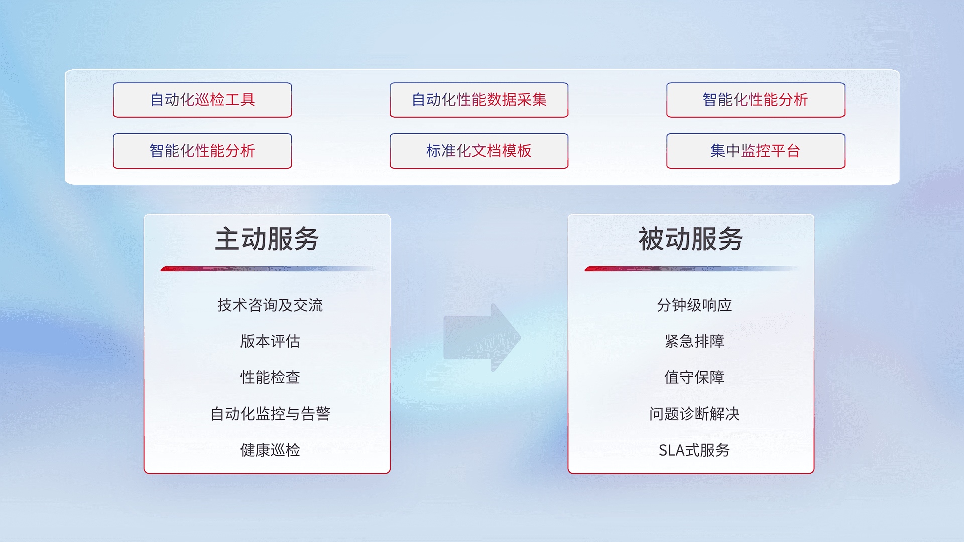智能化工具和标准化文档,,,,保障服务质量,,,提供主动服务(包含技术咨询、、、、版本评估、、、、性能检查、、、、自动化监控与告警、、健康巡检)和被动服务包含(分钟级响应、、紧急排障、、值守保障、、问题诊断解决、、SLA服务)。。。