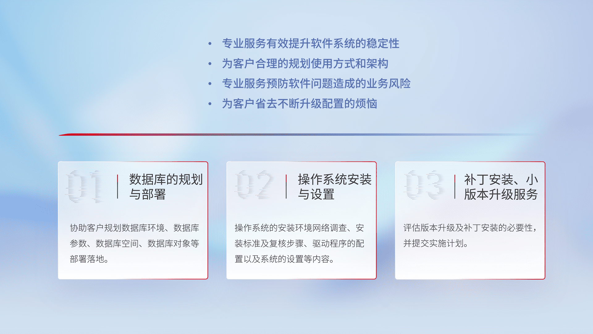 为客户提供软件规模升级、、、、快速部署、、按需配置的专业服务,,,,从数据库的规划与部署到操作系统的安装与设置,,,,再到补丁安装和小版本升级提供支持。。